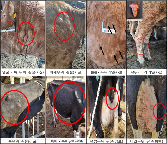 2023년 10월 중순이후 서산의 한후에서 발견된 럼피스킨 병은 10여일이 지난 현재 전국적으로 증상이 나타나고 있어 이미 국내에 전반적으로 확산된 상태로 의심되고 있습니다. 감염된 각 농장에서 참혹한 매몰이 이루어지고 있어 구제역 발생시 보여주었던 참혹한 현상이 전국적으로 나타나 한우농가들을 고통에 빠지게 하고 있습니다. (병원체) Poxviridae과 Capripoxivirus속 LSDV Capripoxivirus속 양두·산양두 바이러스와 높은 유전자 유사성 (96%) □ (특성) 제1종 가축전염병, 세계동물보건기구(WOAH) 리스트(List) 질병 주로 침파리, 모기 등 흡혈곤충(감염축)에 옮기는 바이러스성 질병 감염 소의 피부·점막에 수많은 작은 결절(~5cm), 우유생산 급감, 가죽 손상, 유산, 수소 불임 등 심각한 경제적 손실 유발 □ (감수성동물) 소(cattle) 및 물소(water buffalo) 불현성 감염부터 심각한 증상까지 다양 이환율 5~45%, 폐사율 10% 이하 (WOAH, FAO, FLI) □ (전파경로) 흡혈곤충, 오염물질 등에 의한 전파, 감염축 이동(장거리전파) 주로 흡혈 파리, 모기, 진드기 등 매개곤충에 의해 전파 직접 접촉, 오염 사료·물 섭취, 오염 주사기 등에 의한 전파 가능 □ (증상) 고열(~41℃) 후 전신성의 피부·점막 결절(~5cm)이 주요 증상 잠복기 : 4~14일 (WOAH, 28일) 우유생산량 급감, 침울, 식욕부진, 쇠약, 과도한 침흘림, 눈·코 분비물 증가, 림프절종대, 가슴·다리 등 부종, 유산, 일시적·영구 수소의 불임 등 감염된 소의 초기 증상은 41.5도 이상의 고열과 함께 눈물, 콧물, 침흘림 증상이 보이며, 눈에 띄기 쉬운 체표면 림프절이 커지는 증상 등이 관찰된다. 또한, 착유 중인 소에서는 우유 생산이 급격히 감소하는 증상도 관찰된다. 초기 증상이 보인 이후에는 감염 소에서 지름 5cm 정도의 크고 구슬처럼 단단한 피부 결절이 형성되는데 개체에 따라 심각한 전신성 증상이 나타나거나, 경미하게 몇 개의 결절이 보이기도 한다. 또한 피부뿐만 아니라 눈의 각막, 입 점막, 내부 소화장기, 호흡기, 생식기 등의 점막에서도 결절 병변이 생기므로, 이러한 결절로 인해 심한 눈물, 콧물, 침흘림과 함께 식욕부진, 불임(고환염), 유산 등의 증상도 동반된다 대동물사육농가에서 관찰시 참조사항 발열(귀를 만졌을 때 열감 혹은 따뜻함), 식욕부진, 유량 감소 등 임상증상을 보이는 개체는 얼굴(콧등 주위)→ 목→ 어깨→ 몸통 및 복부 → 유방(젖소·한우) → 다리 순으로 피부를 손으로 부드럽게 촉진해서 단단한 결절과 피부 궤양이 있는지 확인 ※ 유방, 항문 주변, 회음부는 털이 많은 부위보다 결절이 더 잘 보이므로 반드시 관찰 요망피부를 촉진하여 결절이 있는지를 확인하여 증상이 있는 경우 방역당국에 신고하여야 한다.